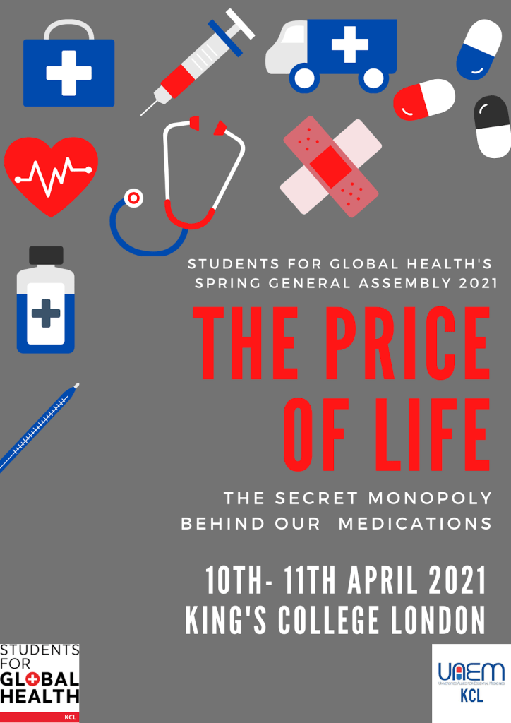 Finally this year, UAEM KCL and SfGH KCL have teamed up for our Spring General Assembly on 10th-11th April to bring you the topic The price of life: the secret monopoly behind our medicines. Stay tuned for more info!