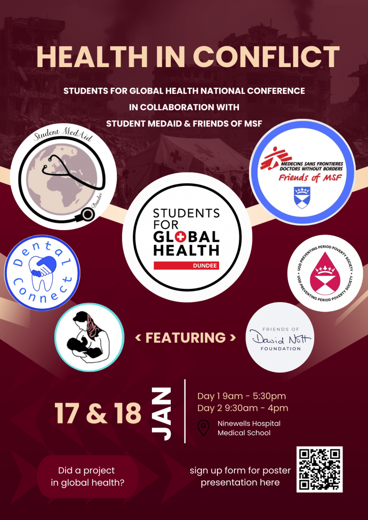 Students for Global Health Dundee are opening their doors and inviting you to their Health in Conflict Conference in collaboration with Students MedAid and Friends of MSF.