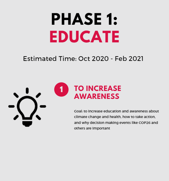To implement much needed awareness raising, advocacy and action, the coordinated theme is leading the COP26 National Working Group, branches, members and the SfGH National Committee to develop and implement climate-focused research, advocacy, and campaigns. This is being done in the two following phases outlined below.